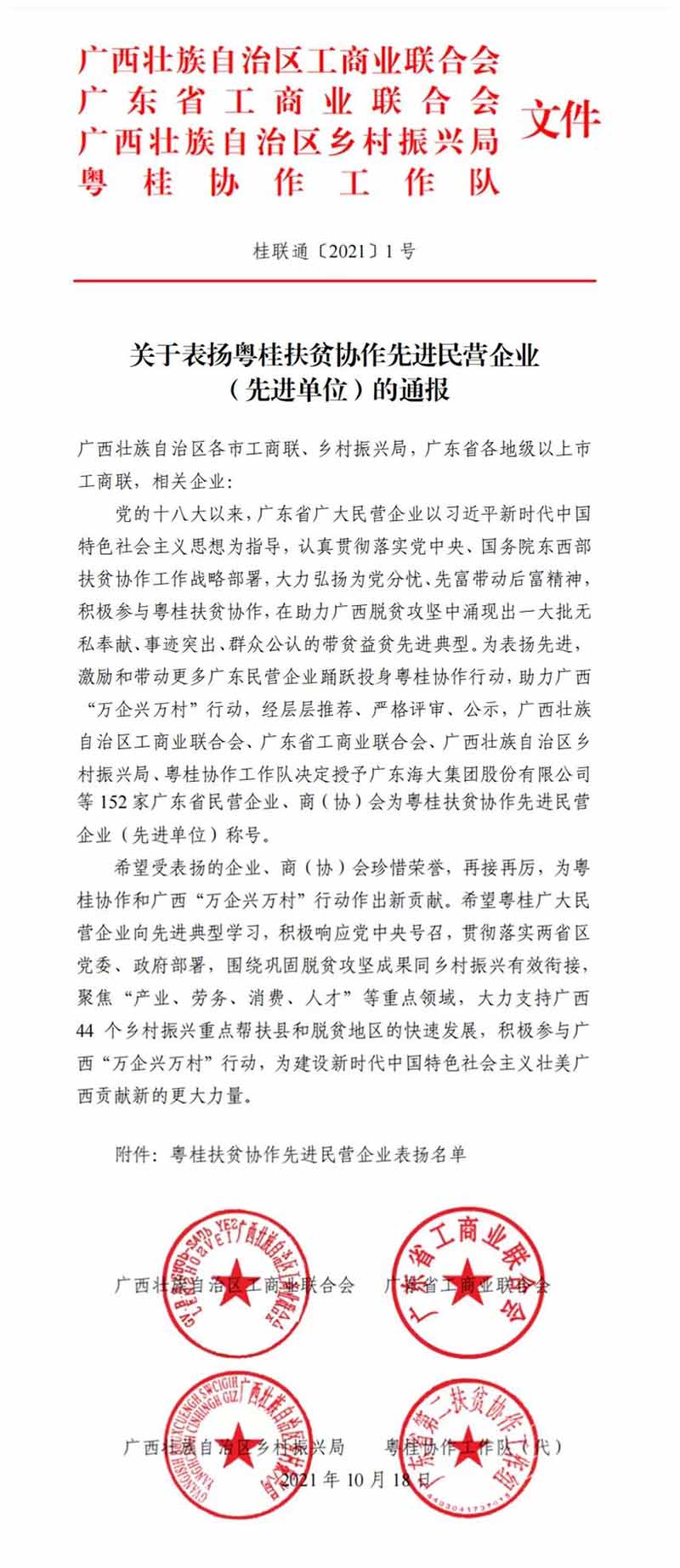 我司與其他151家企業(yè)、商協(xié)會(huì )被評為“粵桂扶貧協(xié)作先進(jìn)民營(yíng)企業(yè)(先進(jìn)單位)”。