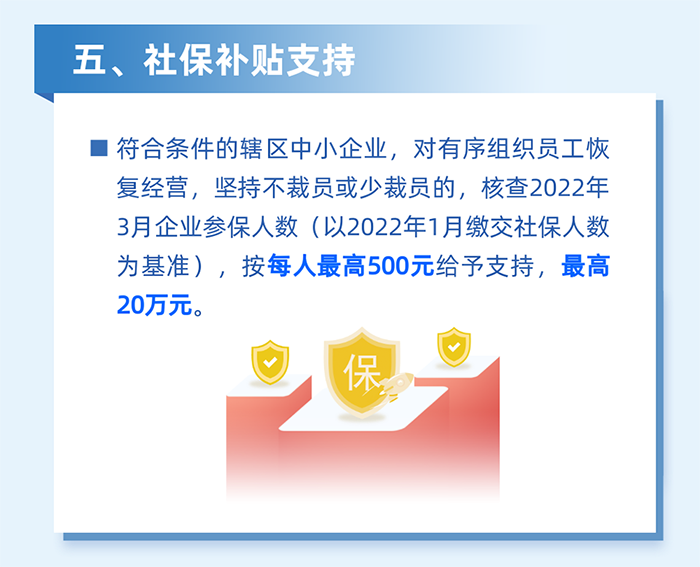 5.對南山區企業(yè)在深圳居住的員工,居住地自2022年2月1日至3月31日期間,因疫情防控被劃定為封控區、管控區(含參照管控區管理區)而影響正常工作的,根據企業(yè)實(shí)際受影響的員工人數給予企業(yè)一次性社保補貼。按企業(yè)為受影響員工上月實(shí)際繳納社會(huì )保險費的30%且每人不超過(guò)600元,給予每家企業(yè)最高不超過(guò)10萬(wàn)元的社保補貼。(責任單位:區人力資源局)