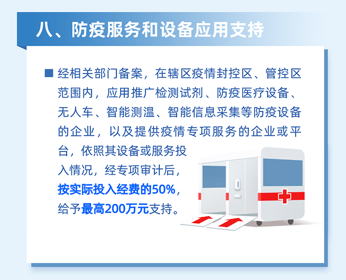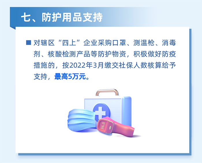 減輕企業(yè)防疫負擔。對為員工采購口罩、測溫槍、消毒劑、核酸檢測產(chǎn)品等防疫用品,以及應用檢測試劑、防疫醫療設備、智能測溫、數字化信息采集、無(wú)人車(chē)等數字防疫設備的區四類(lèi)百強企業(yè),按2022年3月實(shí)際繳納失業(yè)保險人數給予100元/人的補貼,單家企業(yè)最高20萬(wàn)元。(牽頭單位:區工業(yè)和信息化局、科技創(chuàng )新局)