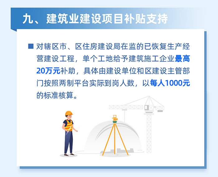 發(fā)放在建項目臨時(shí)停工補貼。對轄區范圍內區住建、區水務(wù)、區城管、區交通以及街道在監的已開(kāi)工建設工程,在政府依法采取停工等緊急措施期間,按市區政府部門(mén)停工通知前一天錄入“兩制”平臺的勞務(wù)工人數給予900元/人的補貼給企業(yè),相關(guān)補貼由企業(yè)通過(guò)“兩制”平臺發(fā)放至勞務(wù)工人賬戶(hù)。(牽頭單位:區住房和建設局)