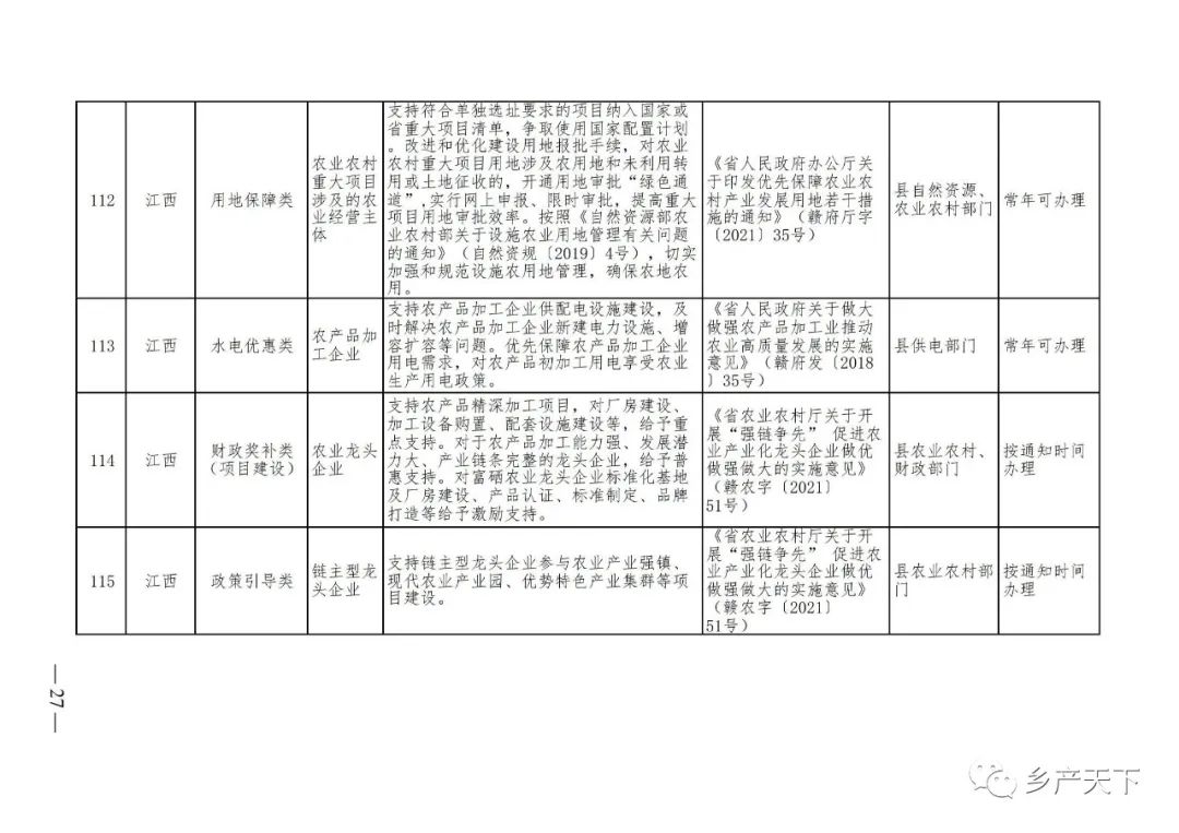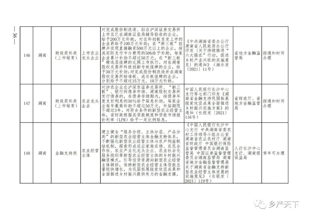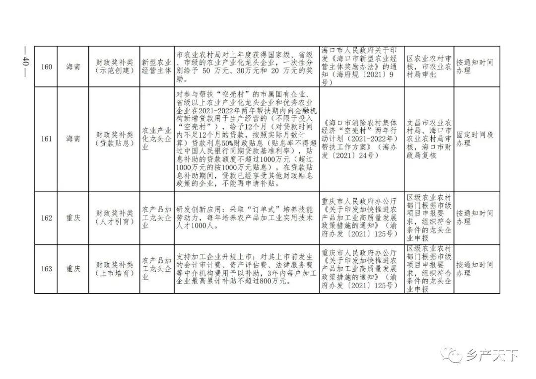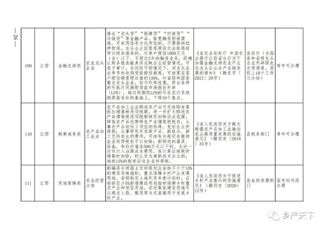 《清單》按照“政策類(lèi)別、支持對象、具體內容、政策依據、辦理部門(mén)、辦理時(shí)間”進(jìn)行梳理,共涉及“財政獎補、金融支持、用地保障、稅費減免、水電優(yōu)惠、政策引導”等六大類(lèi)229條政策?!肚鍐巍吠ㄖ?,各地支持政策發(fā)生變化,要及時(shí)反饋,鄉村產(chǎn)業(yè)發(fā)展司將定期更新發(fā)布。