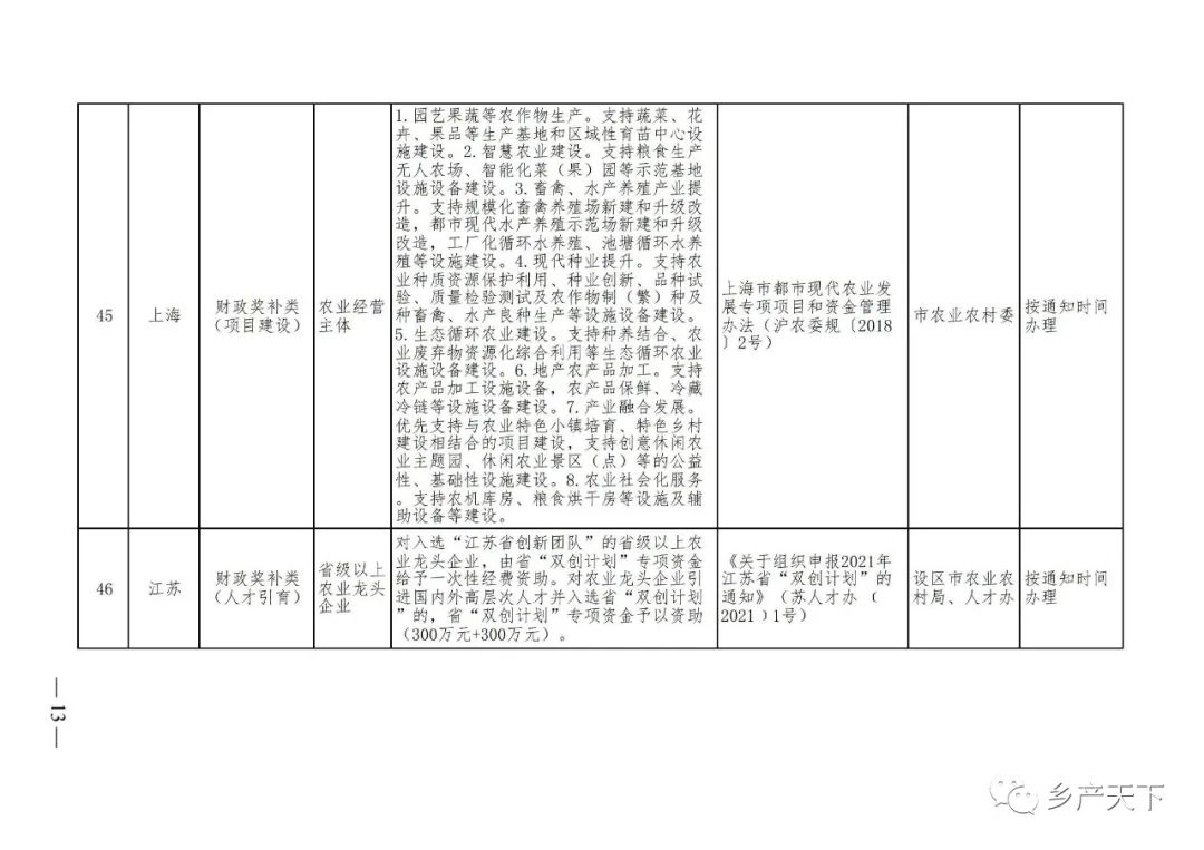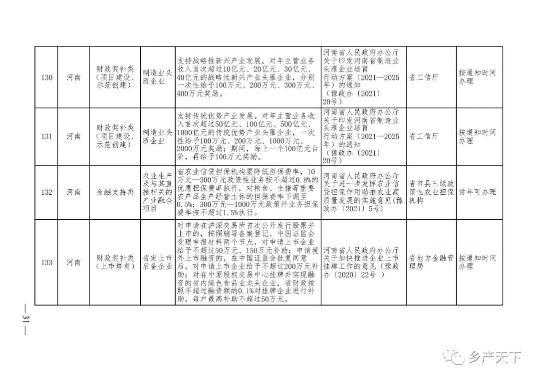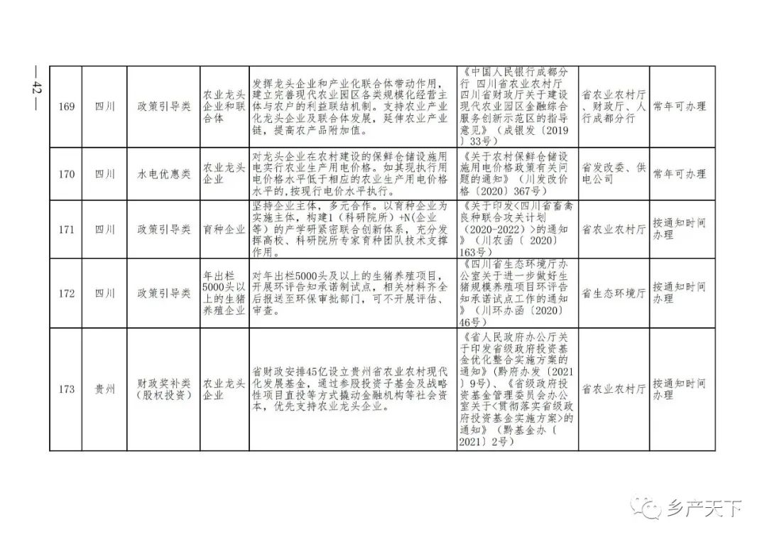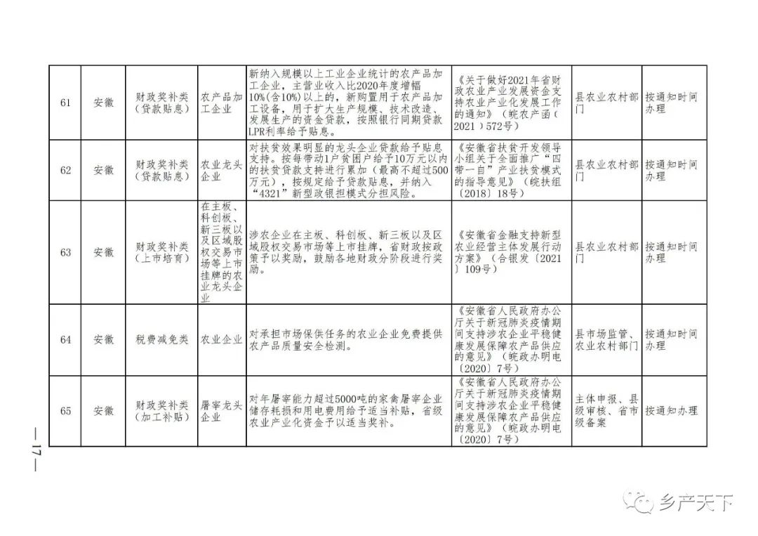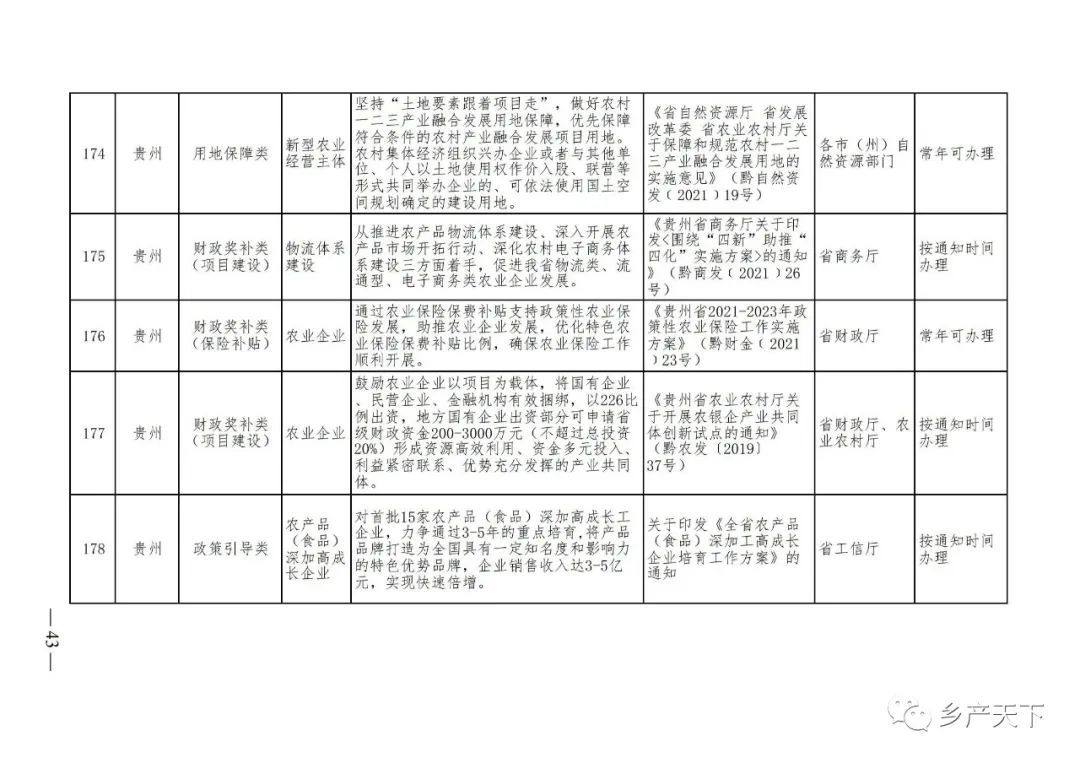 《清單》按照“政策類(lèi)別、支持對象、具體內容、政策依據、辦理部門(mén)、辦理時(shí)間”進(jìn)行梳理,共涉及“財政獎補、金融支持、用地保障、稅費減免、水電優(yōu)惠、政策引導”等六大類(lèi)229條政策?!肚鍐巍吠ㄖ?,各地支持政策發(fā)生變化,要及時(shí)反饋,鄉村產(chǎn)業(yè)發(fā)展司將定期更新發(fā)布。